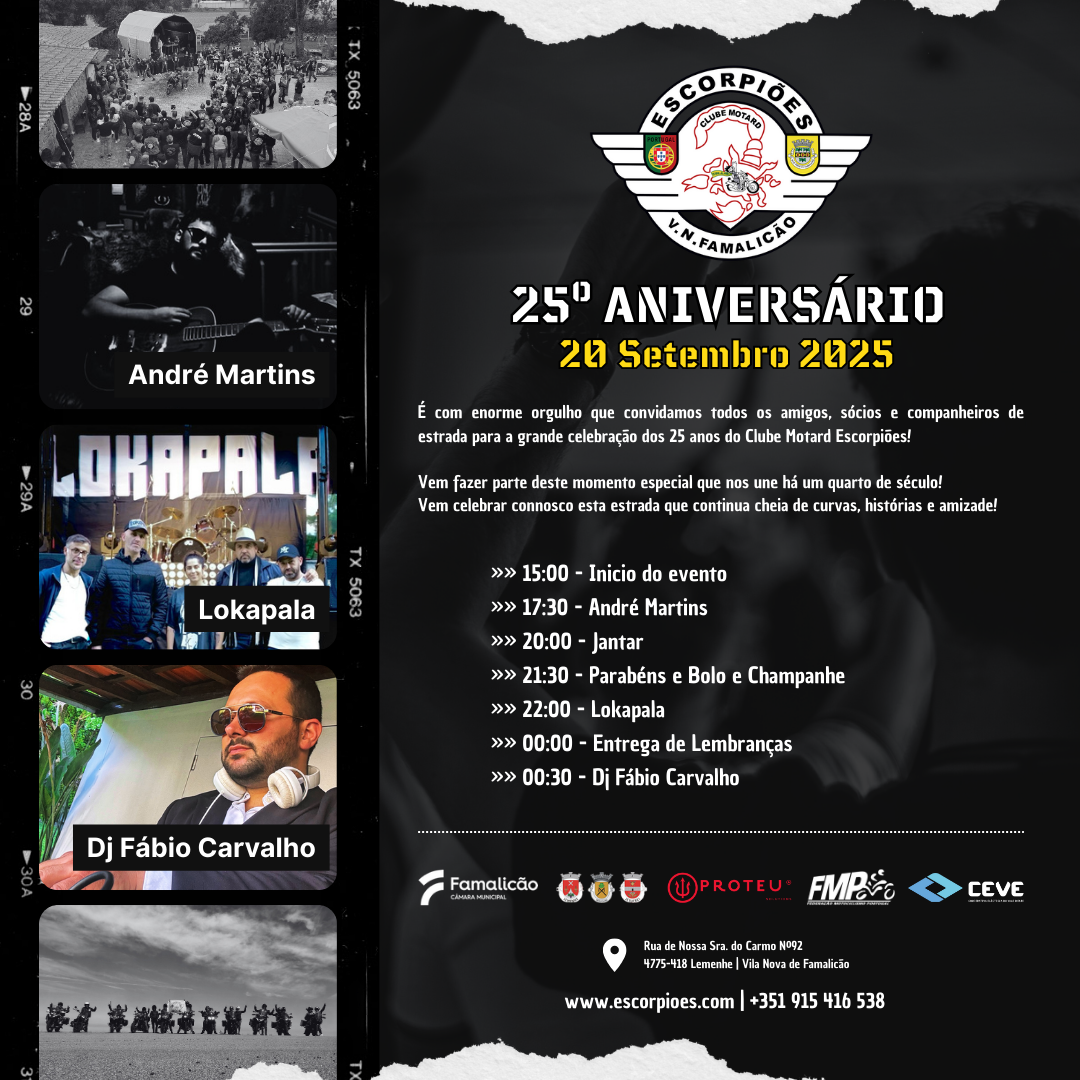 No dia 20 de setembro de 2025, o Clube Motard Escorpiões celebra um marco histórico: 25 anos de existência!Um quarto de século a viver o espírito motard, a partilhar quilómetros, histórias e amizades que ficam para a vida. Este é um momento único e queremos vivê-lo contigo – sócio, amigo…